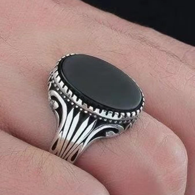New Jewelry European and American Simple Pattern Black Vintage Gemstone Men's Relief Ring