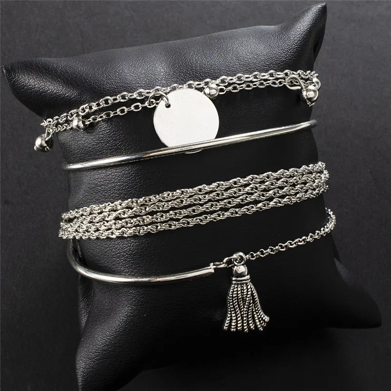 Trendy Geometric Link Chain Tassel Bracelet Set For Women Silver Color Leaves Heart Pendant Open Cuff Bangle Girls Jewelry